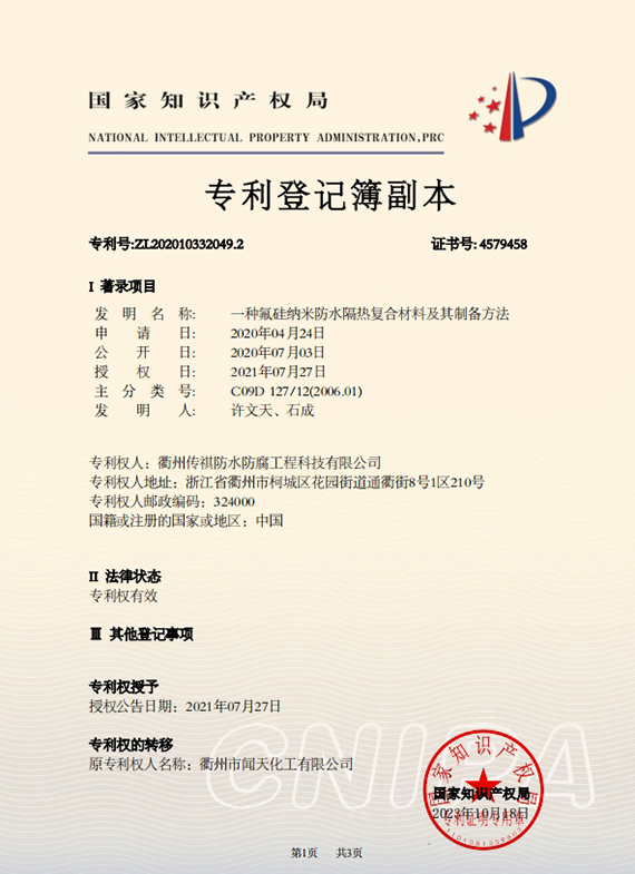衢州傳祺新材料科技有限公司是衢州市聞天化工有限公司的下屬企業(yè);衢州市聞天化工有限公司成立于2003年,是國內(nèi)最早研發(fā)、生產(chǎn)氟碳涂料的企業(yè)之一。衢州傳祺新材料科技有限公司成立于2017年,公司專注于高分子氟材料的開發(fā)和含氟材料在防腐、防水領(lǐng)域的應(yīng)用。經(jīng)過6年的不懈努力,已獲得了化工和建筑領(lǐng)域六項(xiàng)國家發(fā)明專利授權(quán)和兩項(xiàng)新產(chǎn)品科技成果獎(jiǎng),參與了中國建筑材料流通協(xié)會(huì)《房屋修繕防水工程規(guī)范》標(biāo)準(zhǔn)的編制工作,中建協(xié)涂裝委員會(huì)浙西工作站設(shè)立在我公司。
